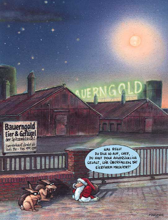 Wir befinden uns im Himmel. Es ist kurz vor Weihnachten, also steht der alljährliche Weihnachtsausflug mit der kompletten Mannschaft an. Wie jedes Jahr hocken sich die großen Drei Jesus, Gott und heiliger Geist zusammen und beraten, wo es denn diesmal hingehen soll. Gott:" Laßt uns nach Las Vegas fahren!" Heiliger Geist: "Aber da fahren wir doch fast jedes Jahr hin, ich will mal was Neues machen - wie ist es mit Jerusalem?" Jesus:" Bloß nicht - das eine Mal hat mir gereicht, aber wie wäre es denn mit Rom?" Heiliger Geist:" Fein, da war ich noch nie!" ------------------------------------------------------------------------ Die ersten Tage verpasst ? Alles nochmal Online unter http://www.mielsch.de/xmas/index.html Was war eigentlich im letzten Jahr ? Nun zu finden unter http://www.mielsch.de/xmas/2001/index.html Weihnachts-Countdown: noch 12 Tage bis X-day. |